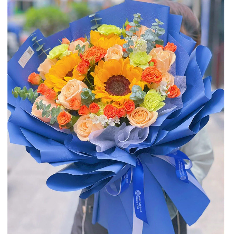 花 材:3支向日葵,11朵香槟玫瑰,搭配4支洋桔梗,6支多头橙色泡泡,尤加利叶装饰。
