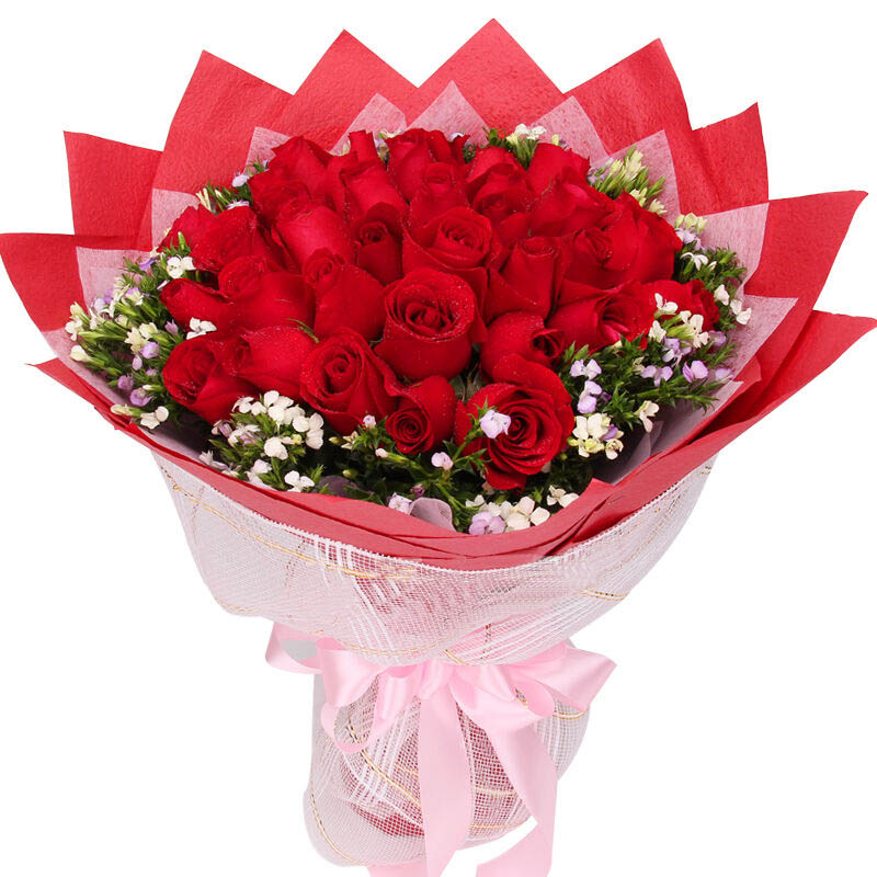 花材: 33支精品红玫瑰,搭配适量尤加利叶、栀子叶装饰。