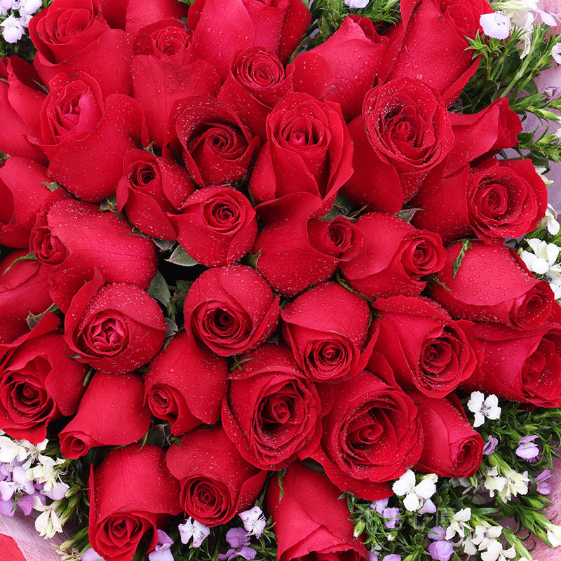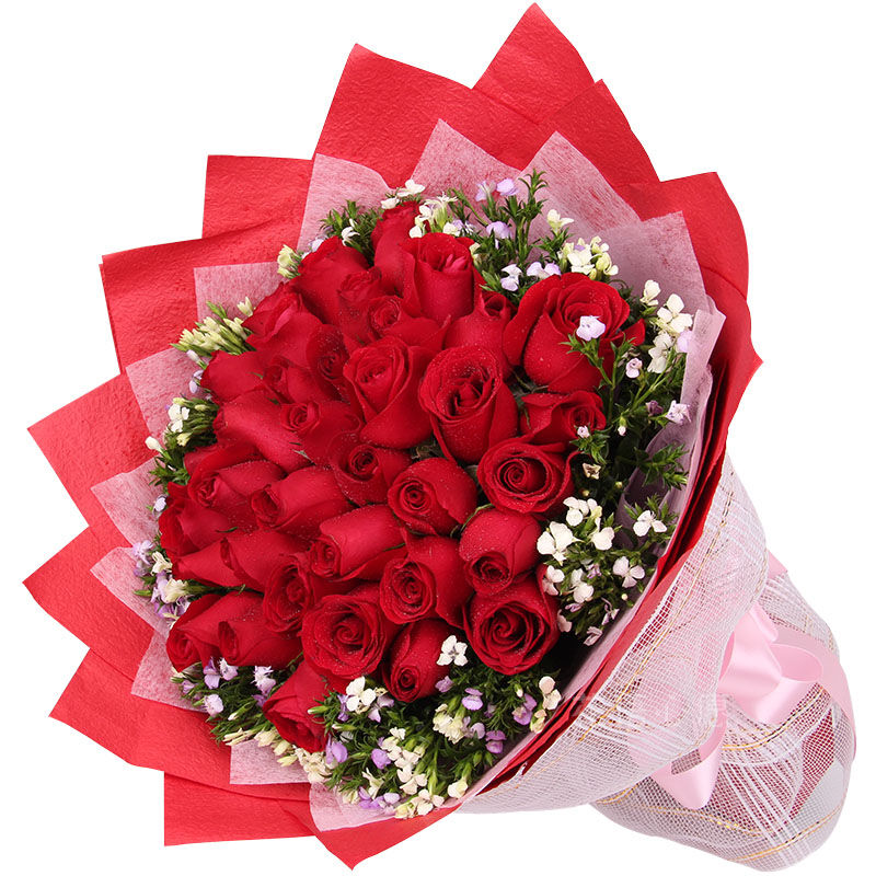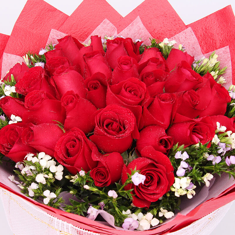 花 材:33支精品红玫瑰,搭配适量尤加利叶、栀子叶装饰。