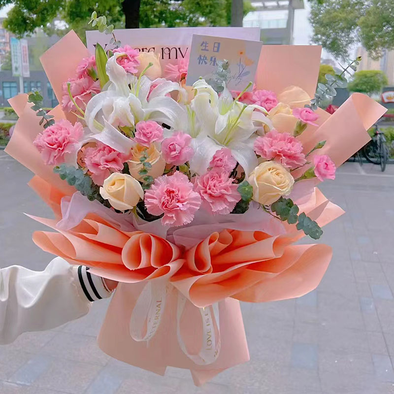 花 材:19朵玫瑰康乃馨混搭(粉色康乃馨、香槟玫瑰、粉玫瑰),2支多头白色香水百合,搭配尤加利叶装饰。