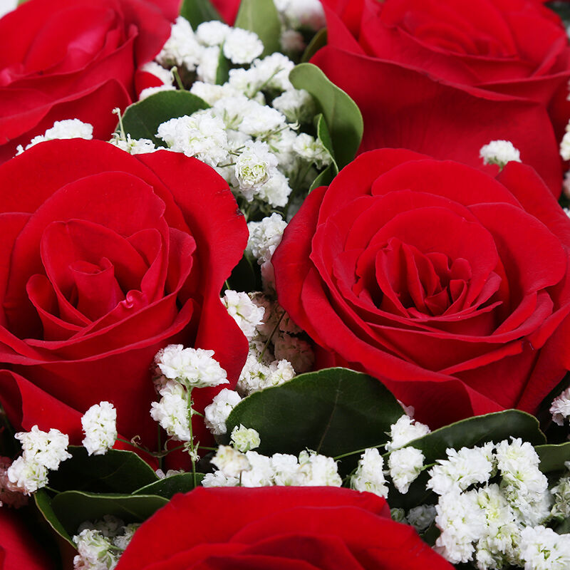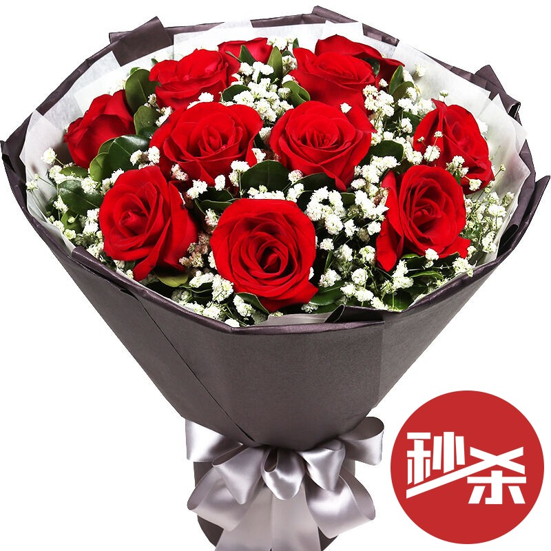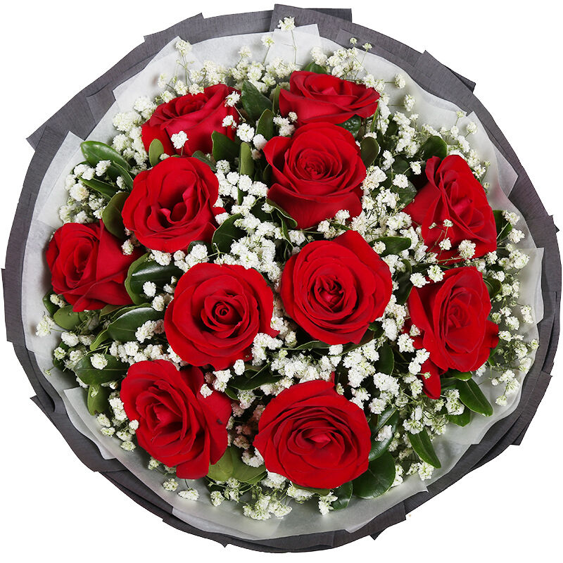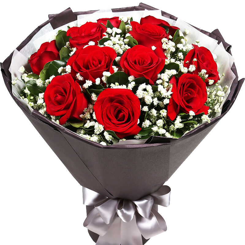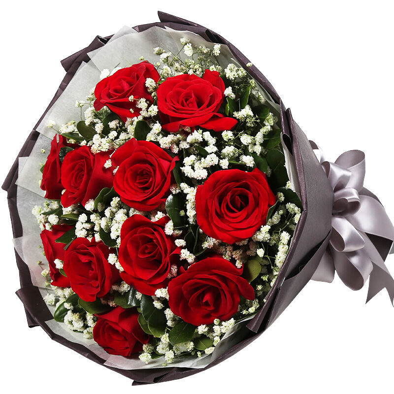 花材: 11支精品红玫瑰,搭配适量白色满天星、栀子叶