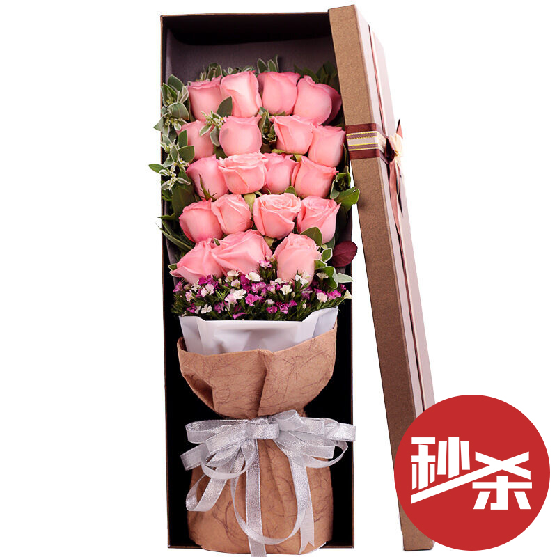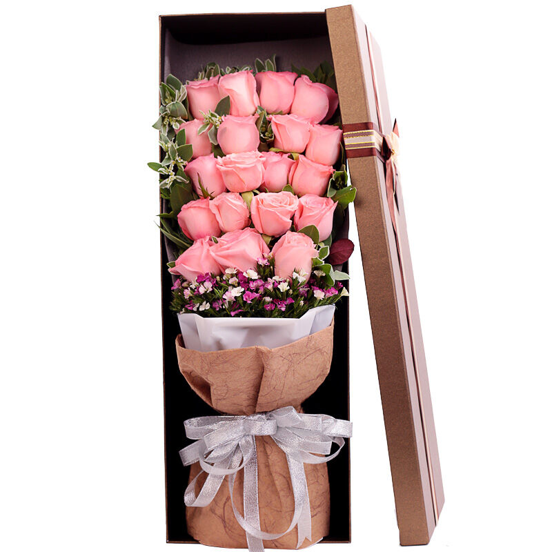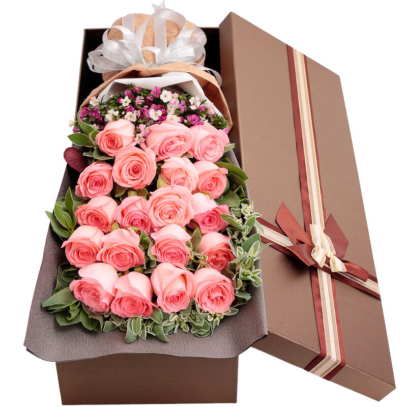 花 材:19支精品粉玫瑰,搭配适量石竹梅、叶上花