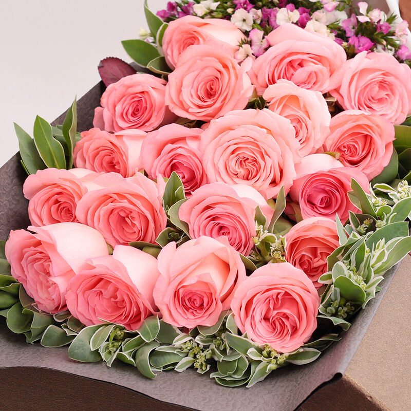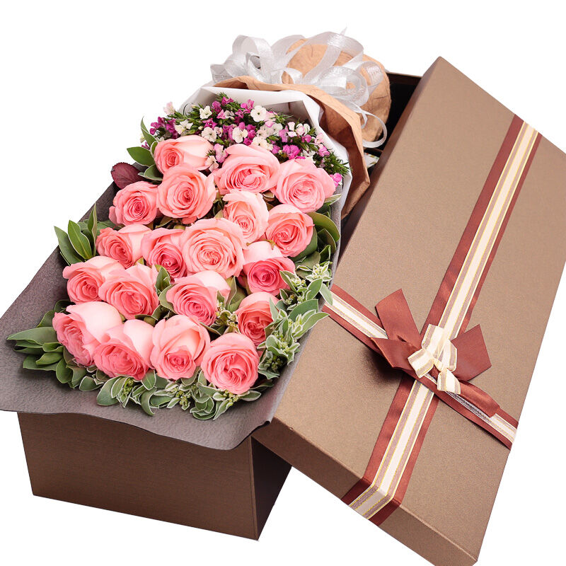 花材: 19支精品粉玫瑰,搭配适量石竹梅、叶上花