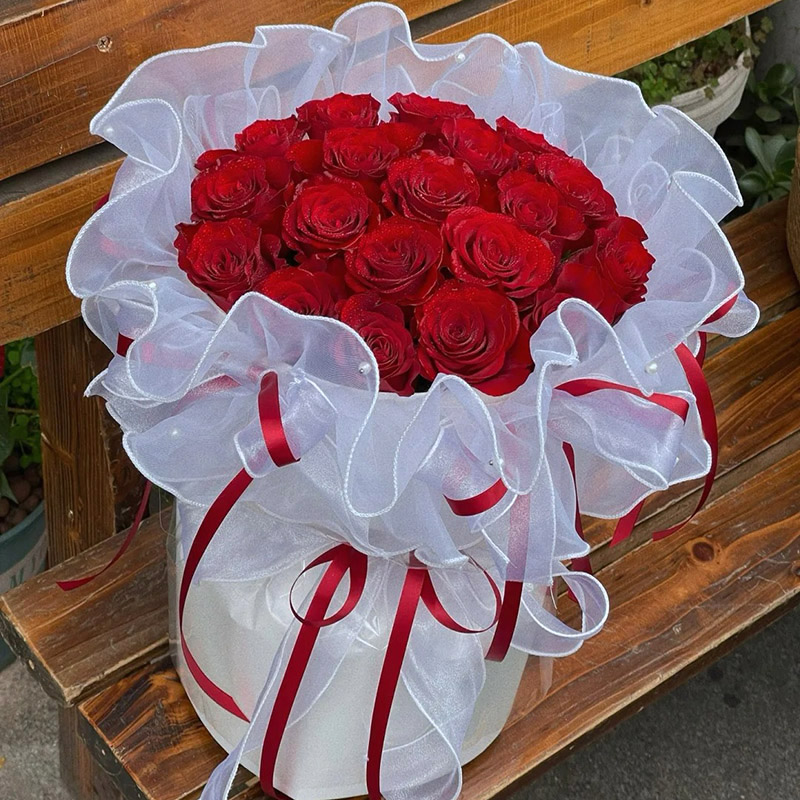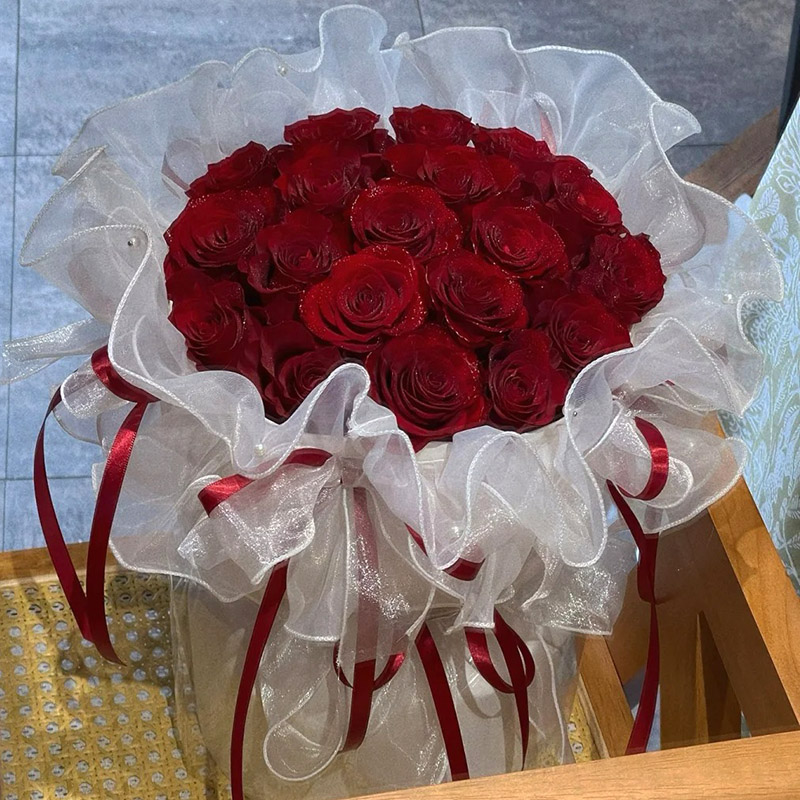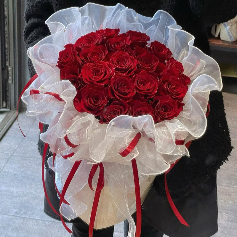 包装: 白色欧根纱,红色缎带围绕花束装饰。