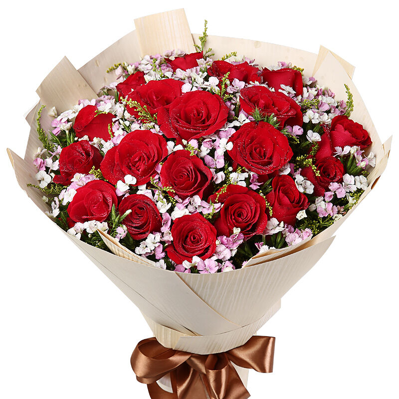 花 材:19支精品红玫瑰,搭配适量粉色石竹梅、黄莺间插