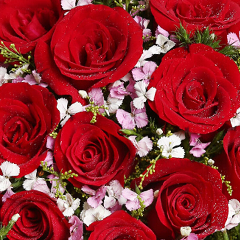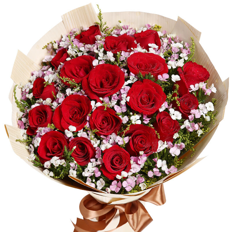 花材: 19支精品红玫瑰,搭配适量粉色石竹梅、黄莺间插
