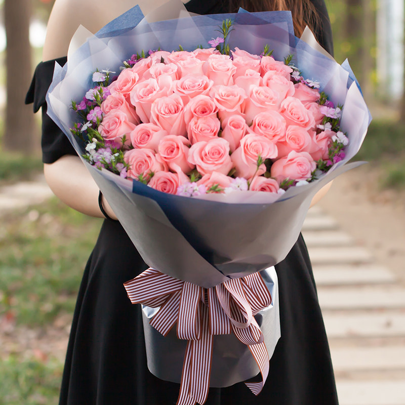 花材: 33支粉玫瑰,搭配适量相思梅装饰。