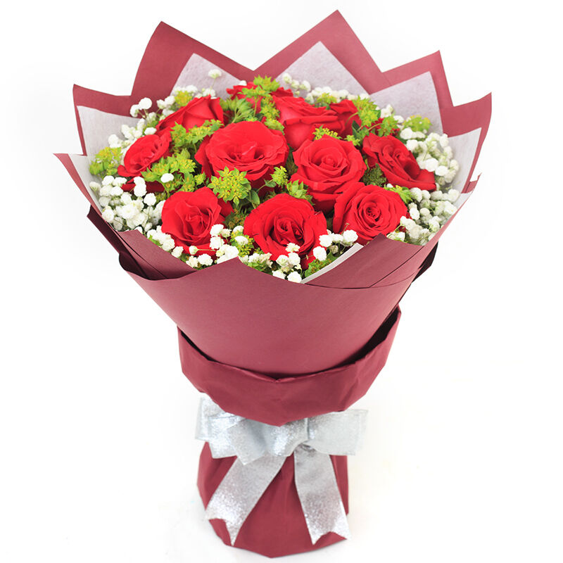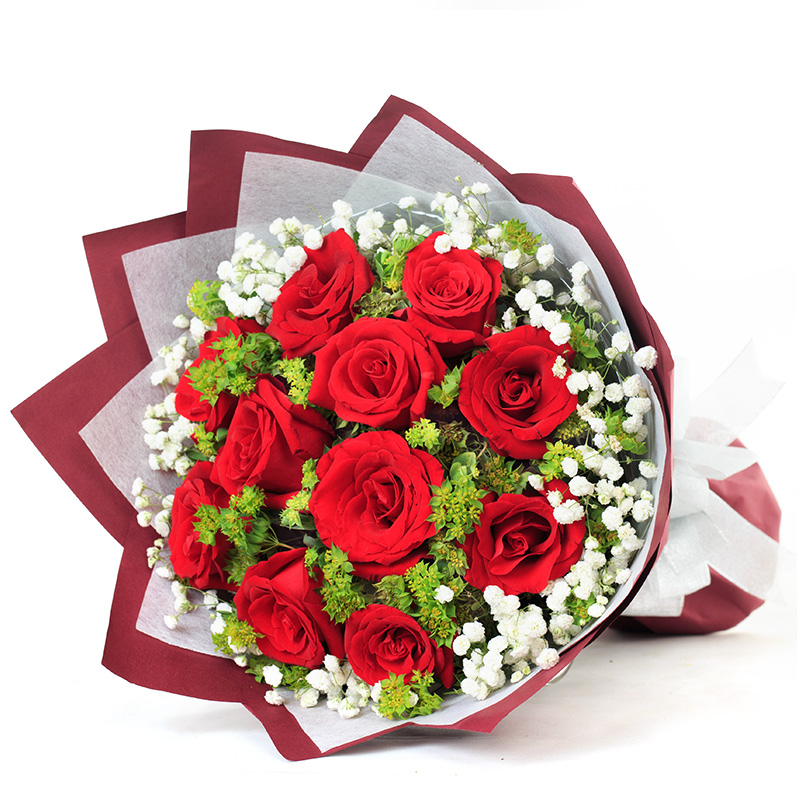 花 材:11支红玫瑰,搭配适量满天星、叶上黄金或尤加利叶装饰。
