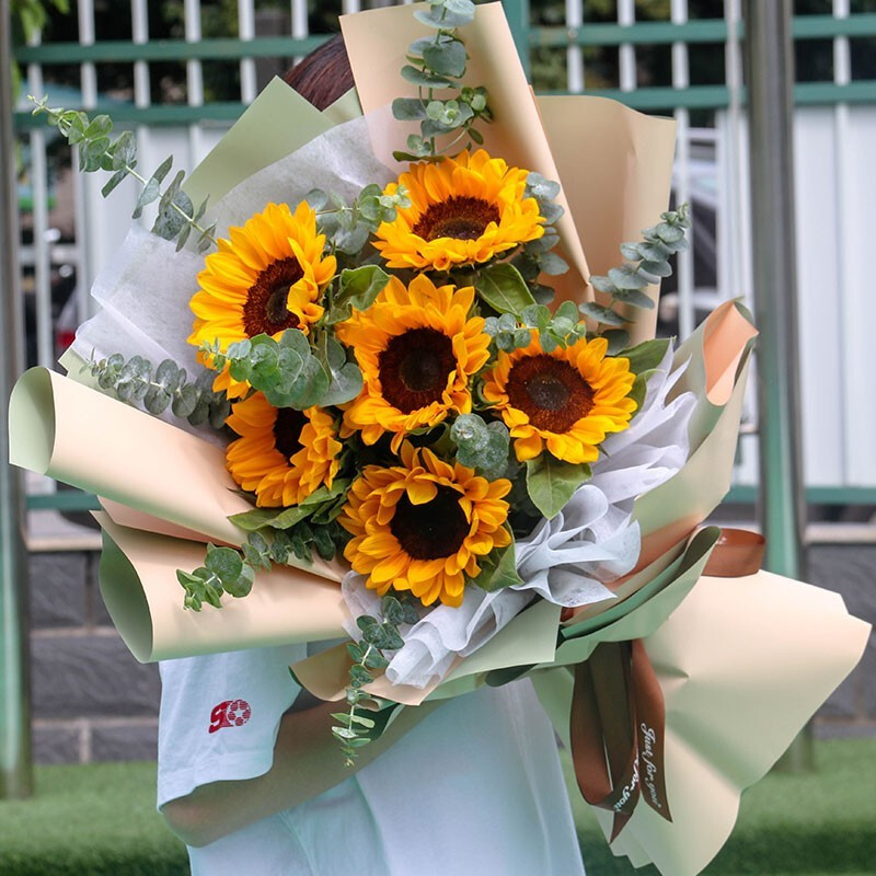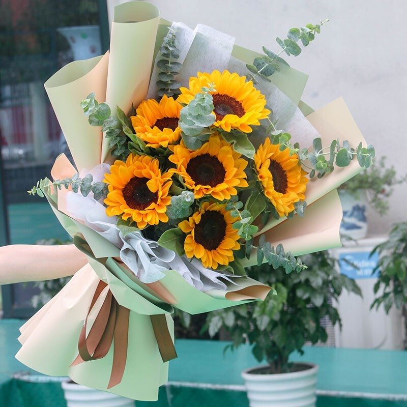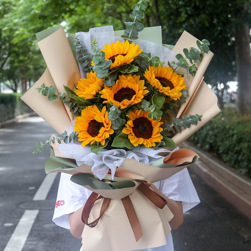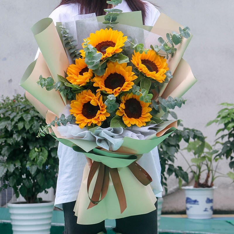 花 材:精选6支向日葵,搭配尤加利叶、绿叶装饰。