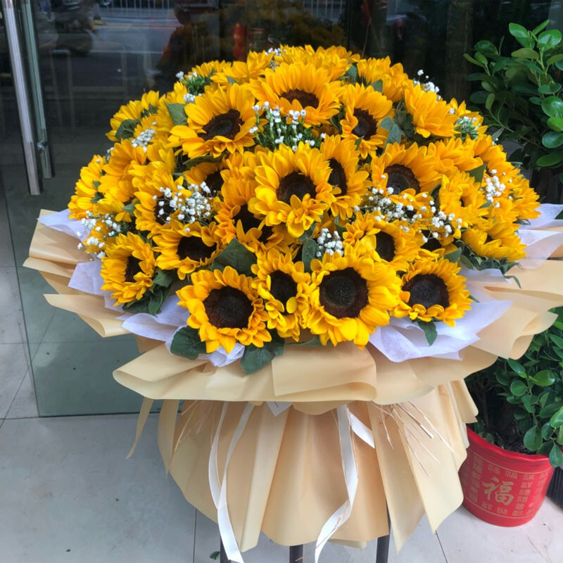 花 材:精选99支向日葵,搭配满天星、绿叶装饰。白色雪梨纸内衬,香槟色雾面纸多层外包,同色系缎带花结。