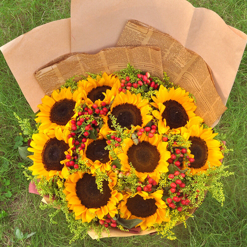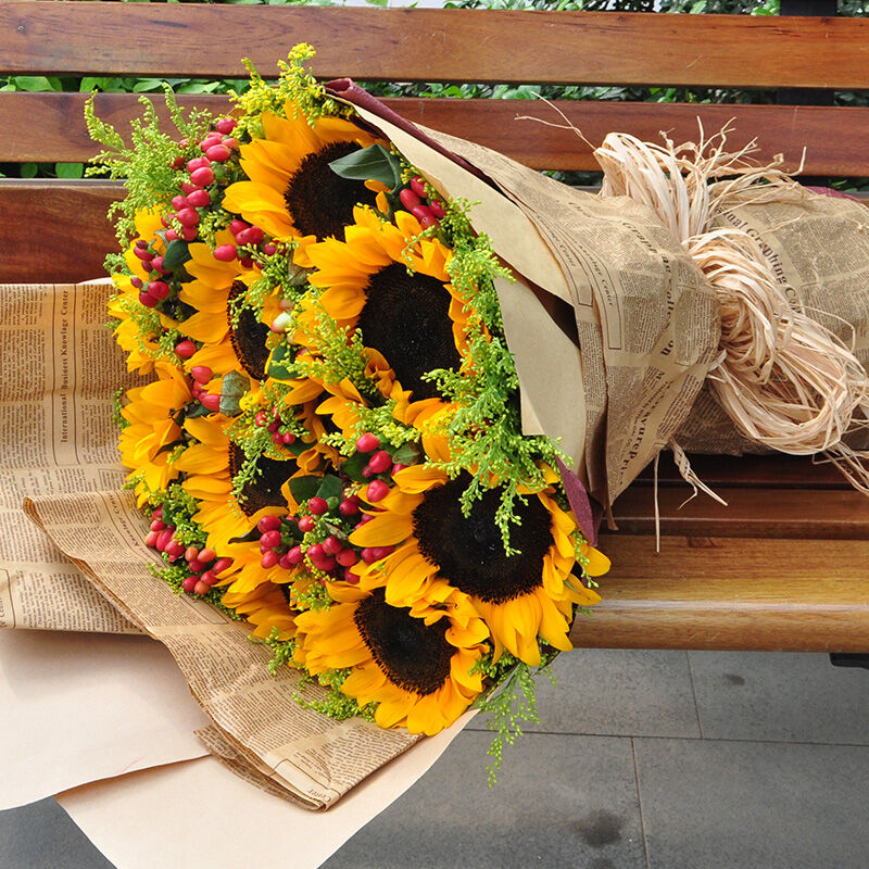 花材: 精选10枝向日葵花束,间插黄莺、相思红豆点缀。