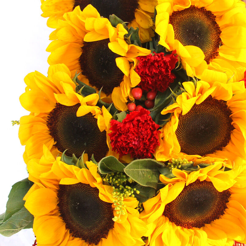 花 材:精选10枝向日葵花束,间插黄莺、相思红豆点缀。