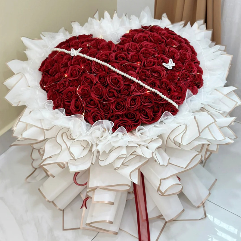 包装: 心形造型,波浪纱内衬,白色金边雾面纸多层包装(断货则用白色雾面纸包装),红色缎带花结。