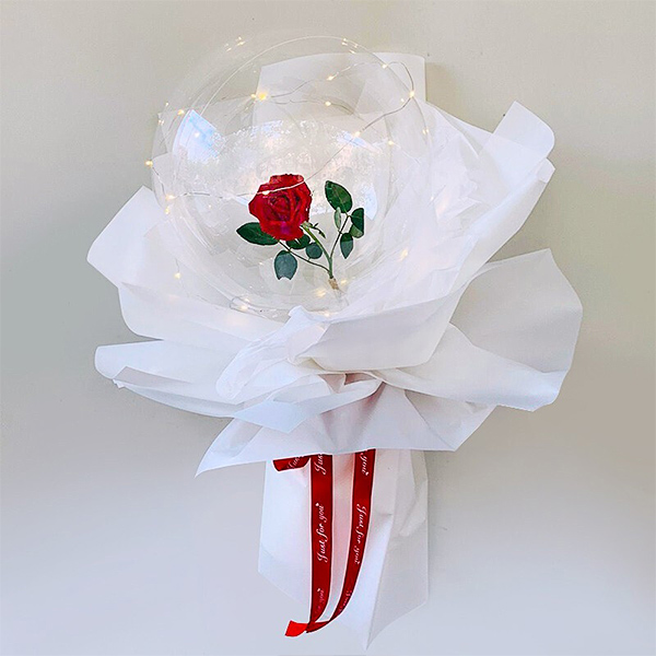 花材: 1朵精品红玫瑰,可亮灯带一条,波波气球(玫瑰颜色可替换)