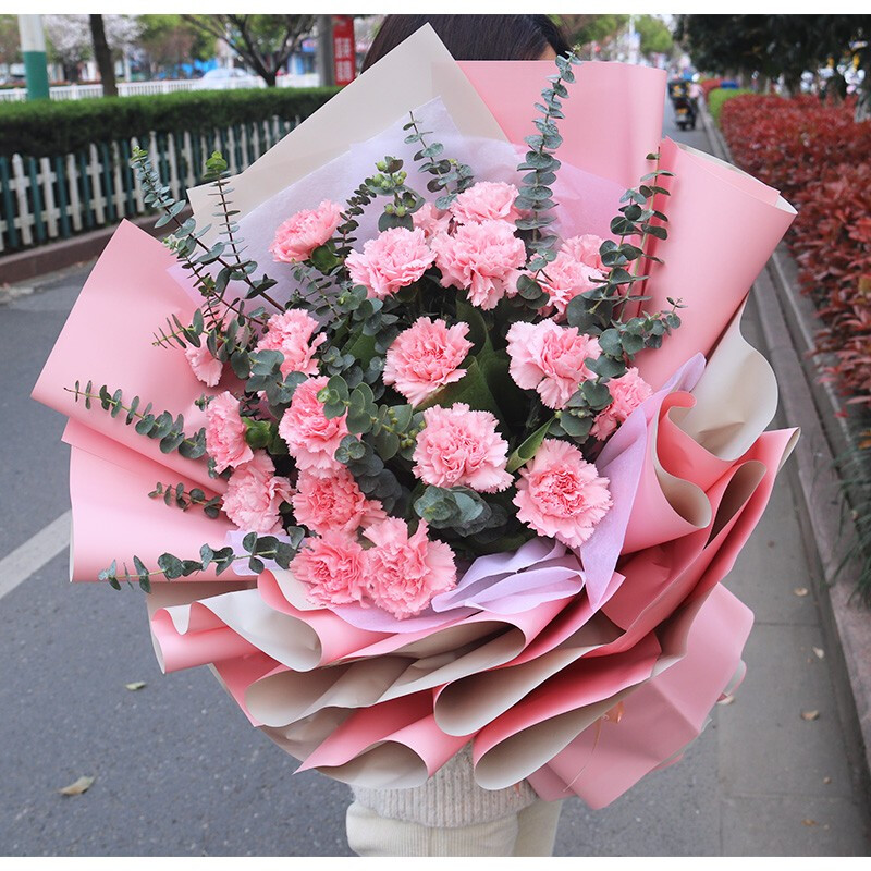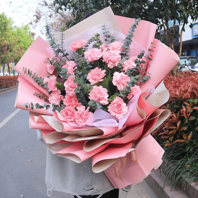 花材: 19朵粉色康乃馨,搭配尤加利叶。