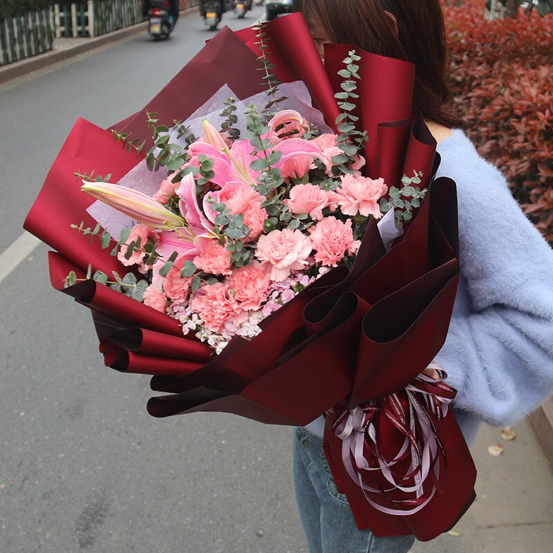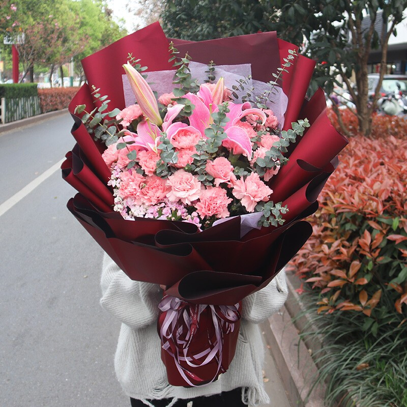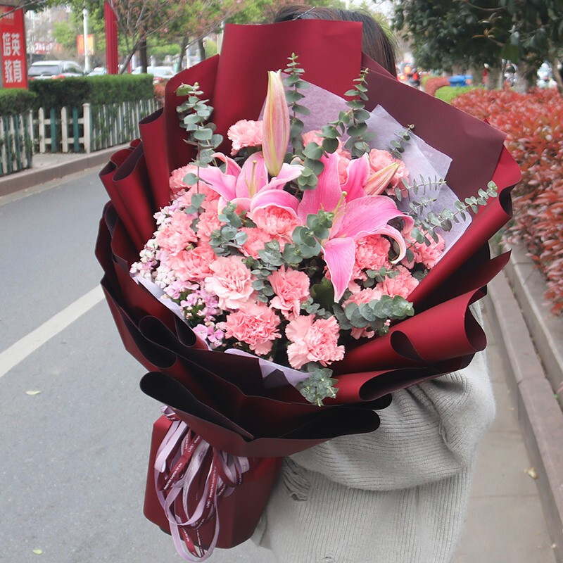花材: 19支粉色康乃馨,2支多头粉百合,搭配尤加利叶、石竹梅等配花。