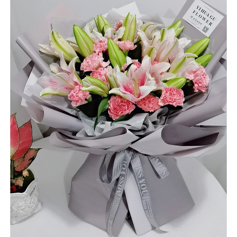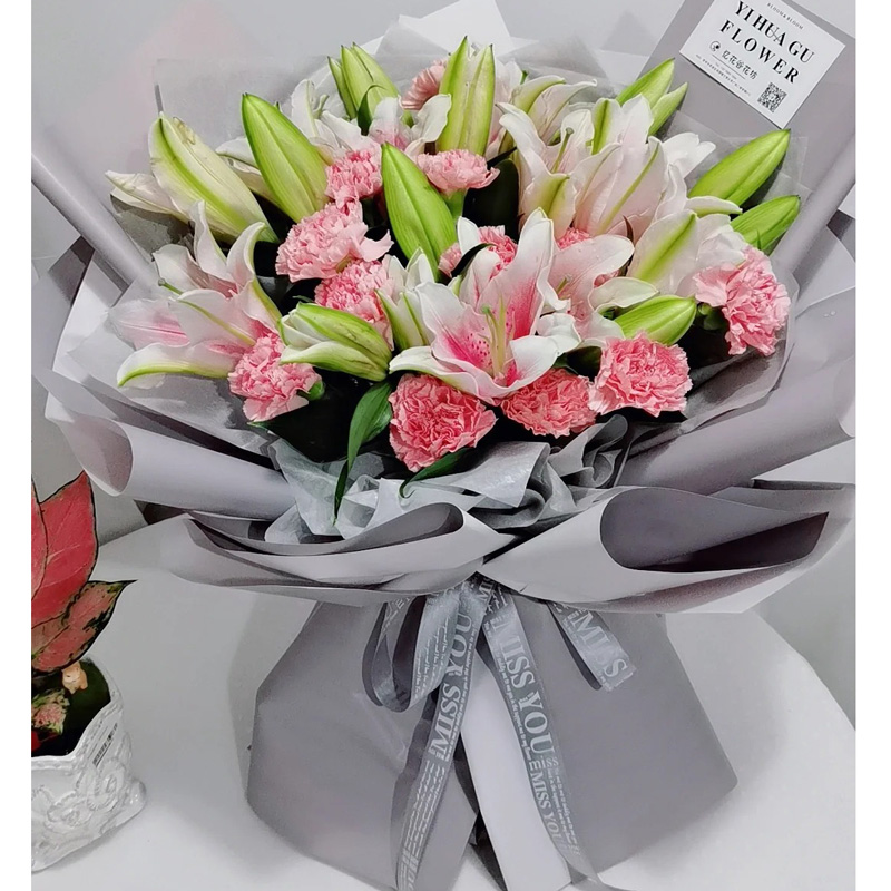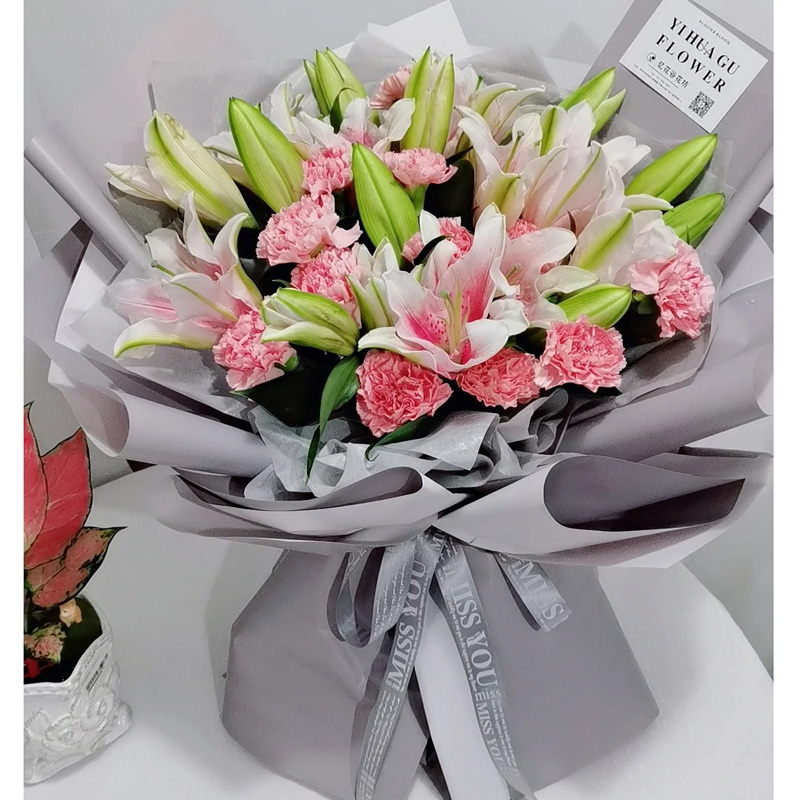 花材: 11朵粉色康乃馨,5支粉色多头香水百合,搭配栀子叶装饰。