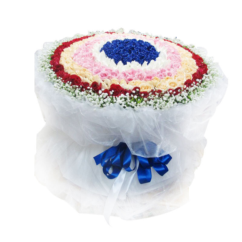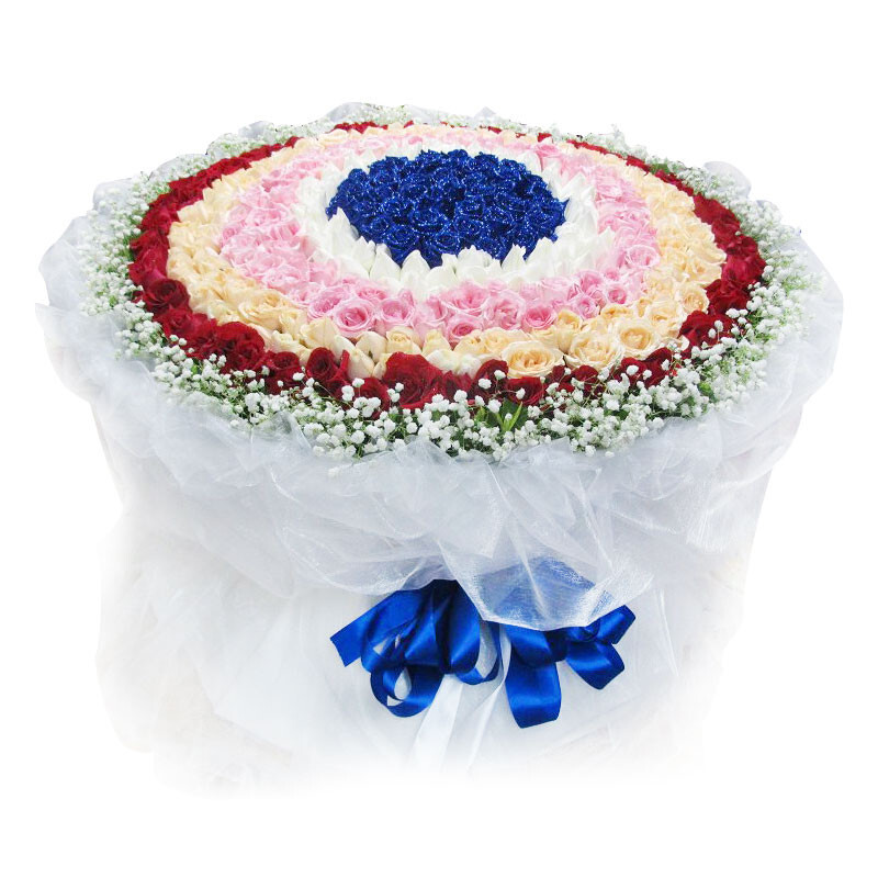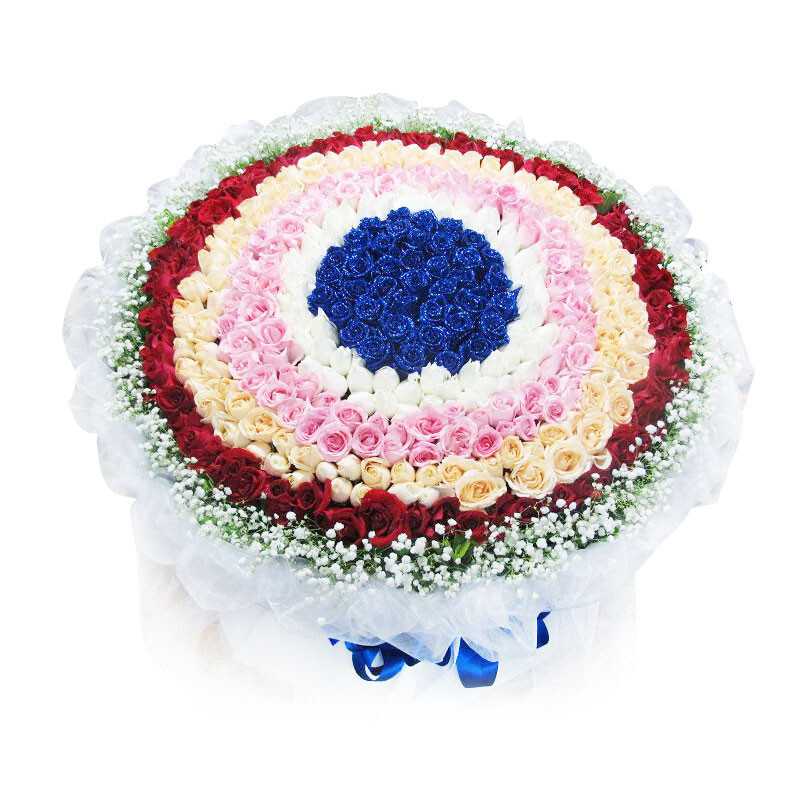 花 材:365朵玫瑰(蓝色、白色、粉色、香槟色、红色),一圈圈按颜色环绕,满天星最外围点缀。