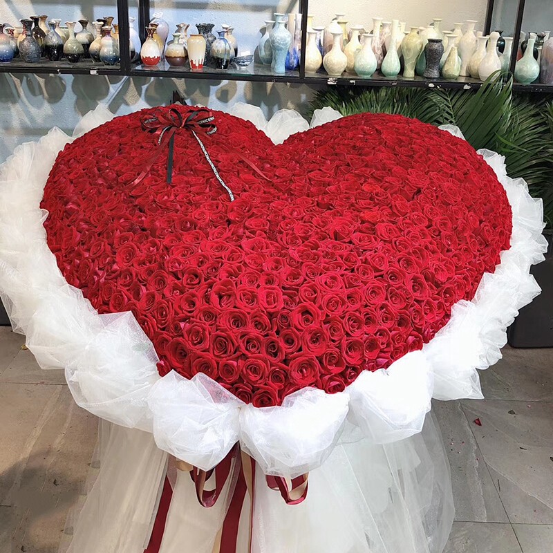花材: 精选999朵红玫瑰,饱满心形造型,同色系蝴蝶结左上角表面装饰。