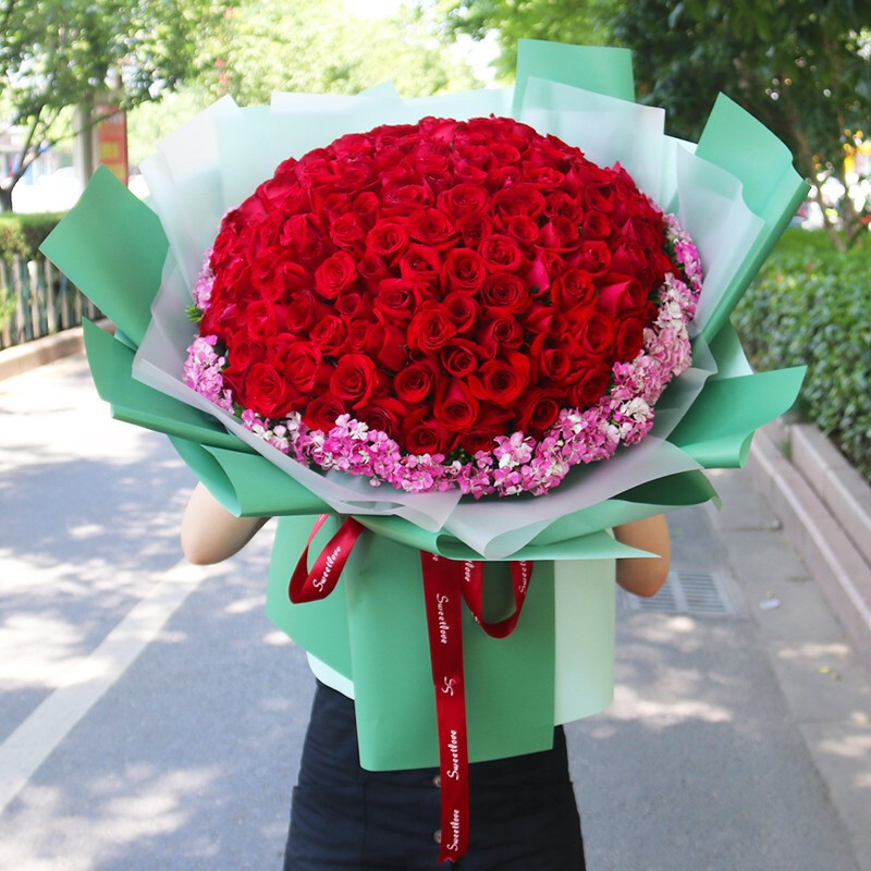 花 材:精选99朵红玫瑰,石竹梅环绕。