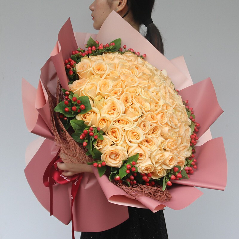 花材: 99朵精品香槟玫瑰,外围红豆环绕。