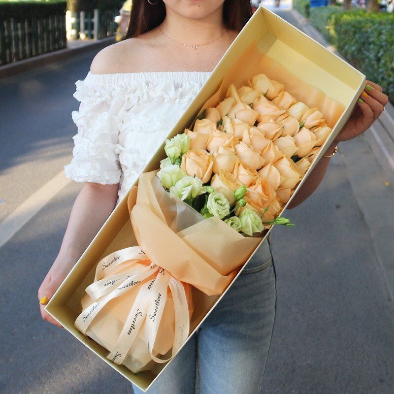 花材: 精选33朵香槟色玫瑰,桔梗装饰。