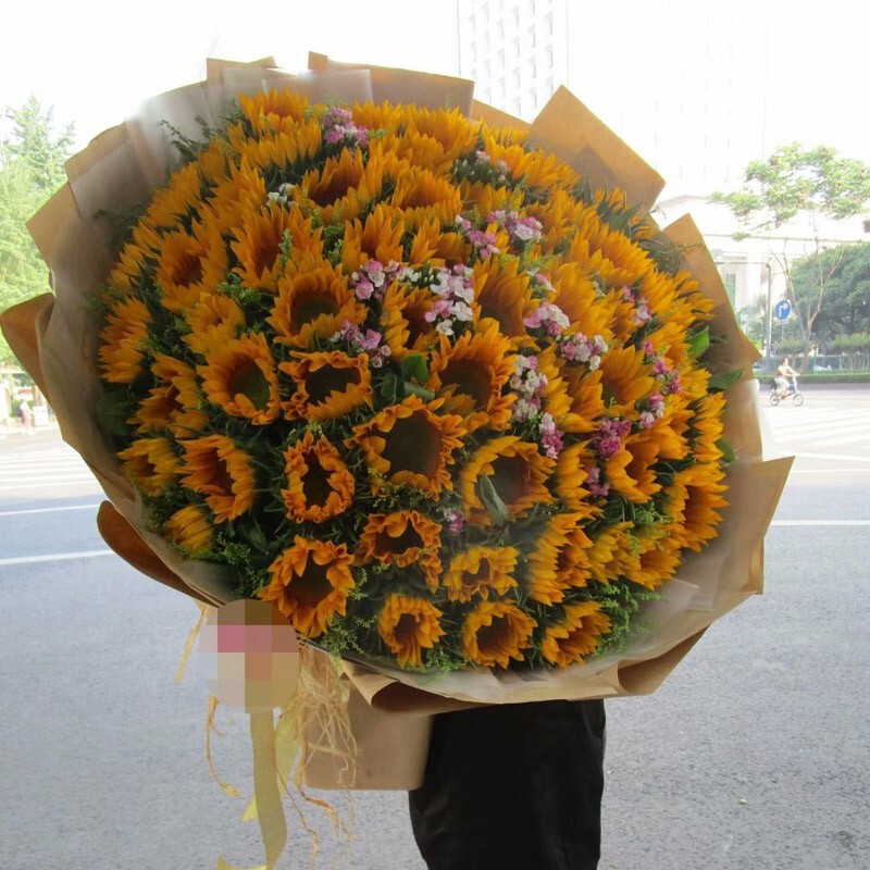 花材: 精选99朵向日葵,相思梅点缀,牛皮纸外包,同色系香槟色花结。