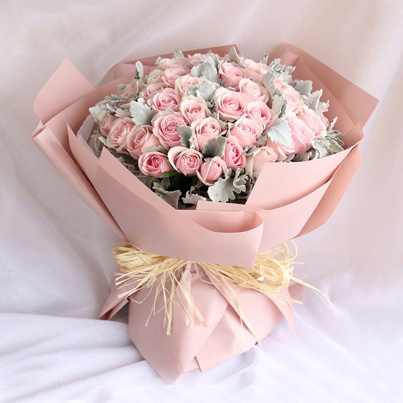 花 材:52朵粉玫瑰,搭配银叶菊装饰。