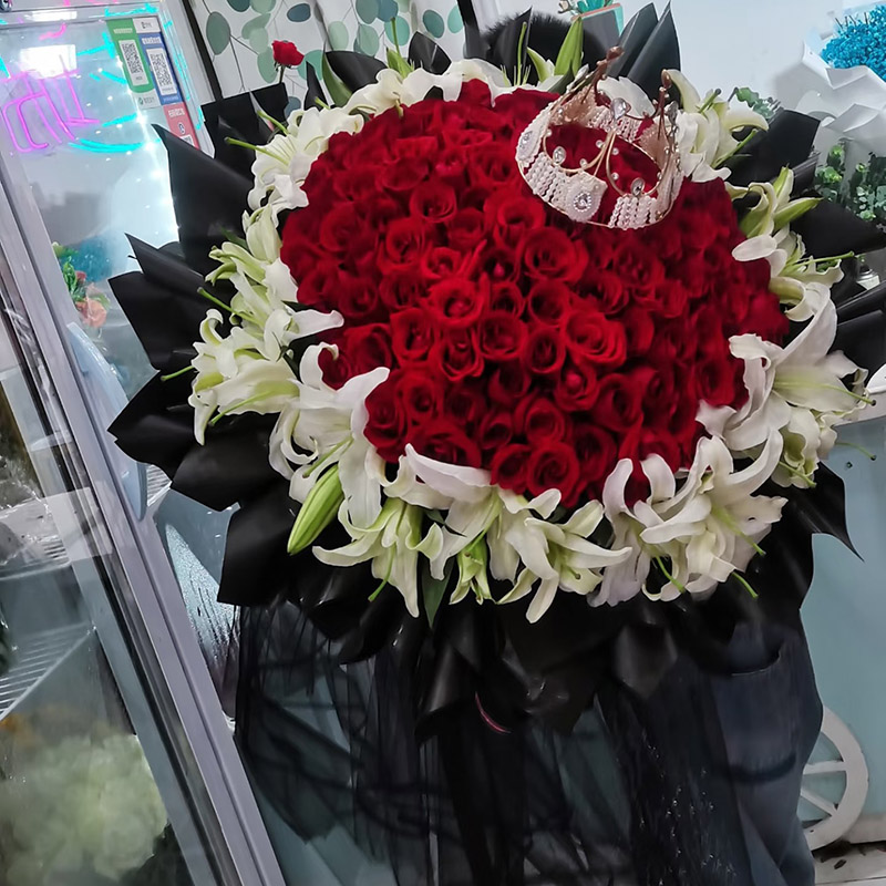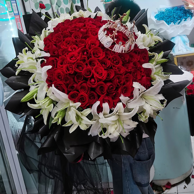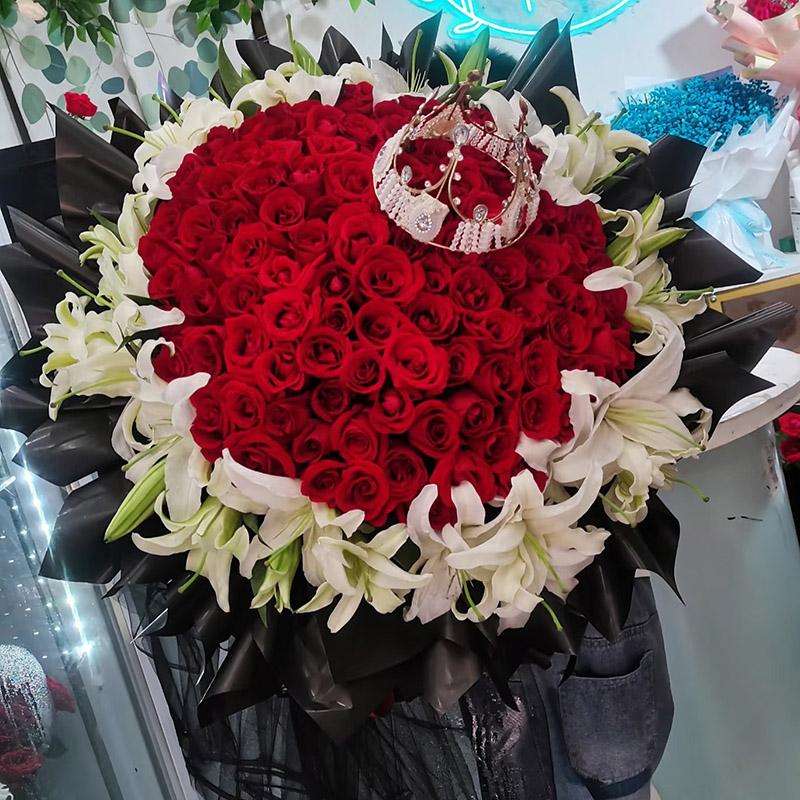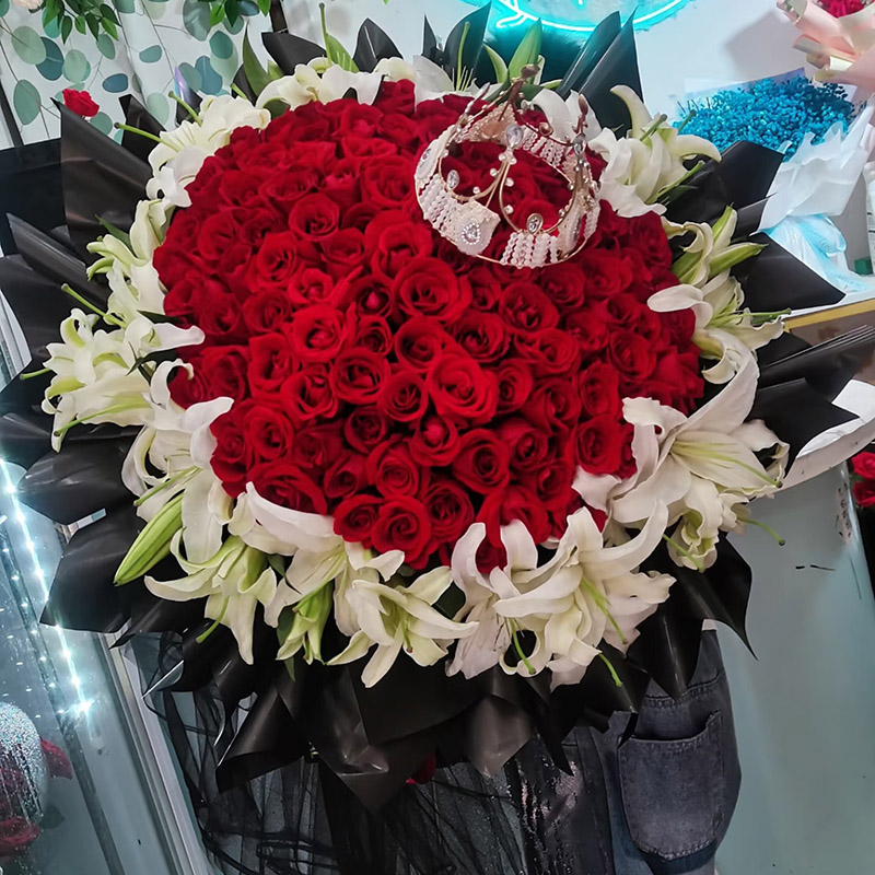 花 材:99朵顶级红玫瑰,33朵白色香水百合外围环绕,皇冠装饰花面。