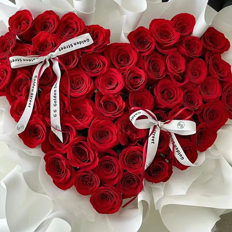 花材: 52朵红玫瑰心形造型,花面2条缎带蝴蝶结装饰。