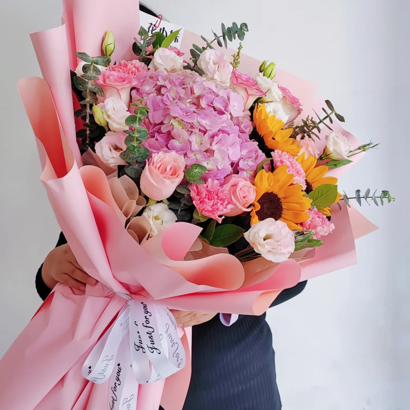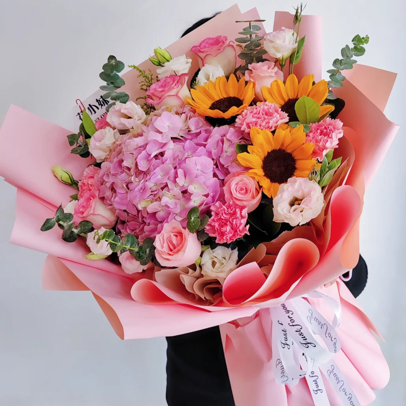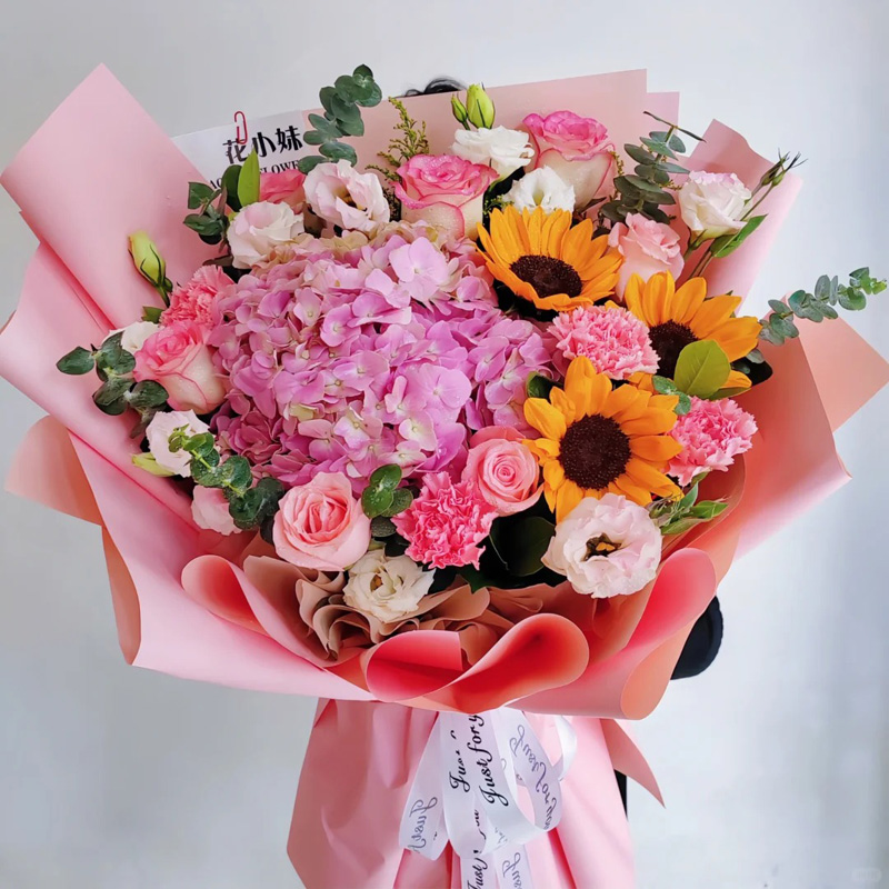 花 材:3朵向日葵,粉玫瑰、粉色康乃馨混搭共11朵,1支粉色大绣球,搭配8支洋桔梗(断货则用同数量玫瑰或者多头橙色泡泡代替),尤加利叶装饰。