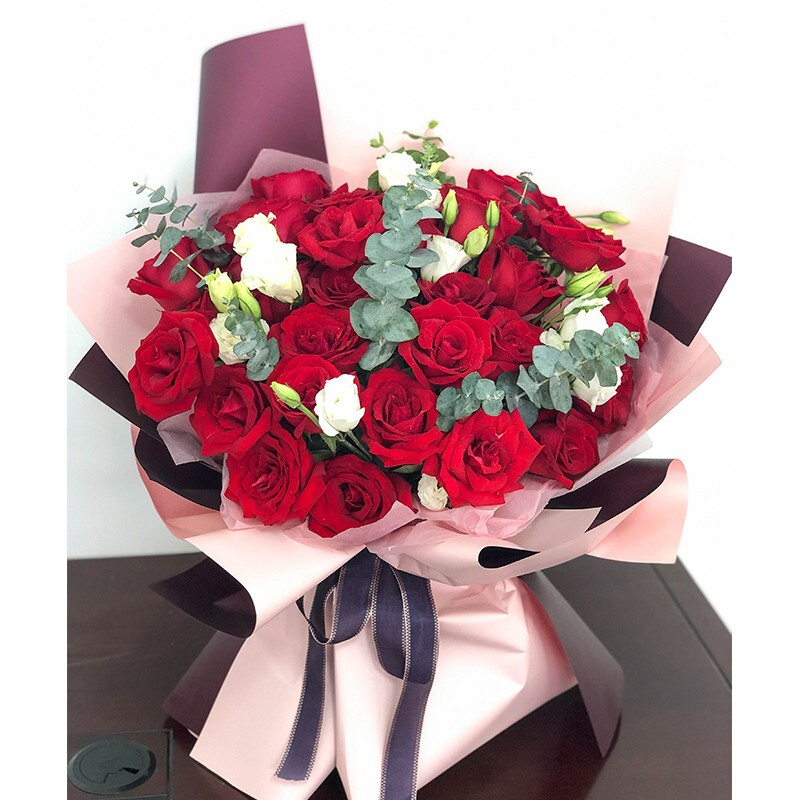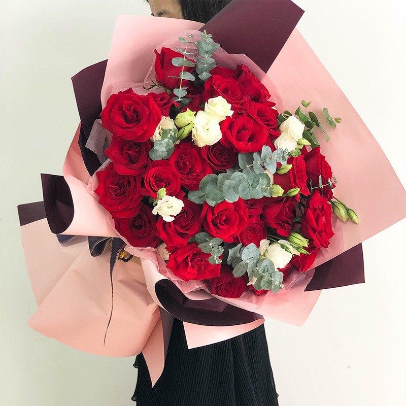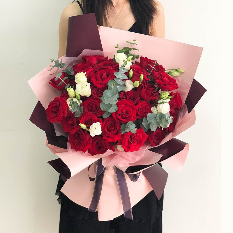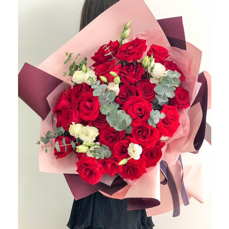 花 材:33朵精品红玫瑰,搭配桔梗、尤加利叶装饰。