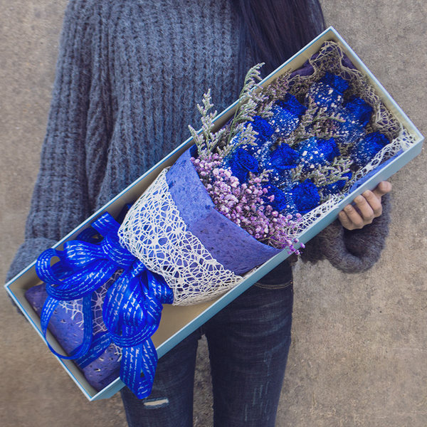 花材: 11朵蓝色妖姬,搭配情人草、粉色满天星装饰。