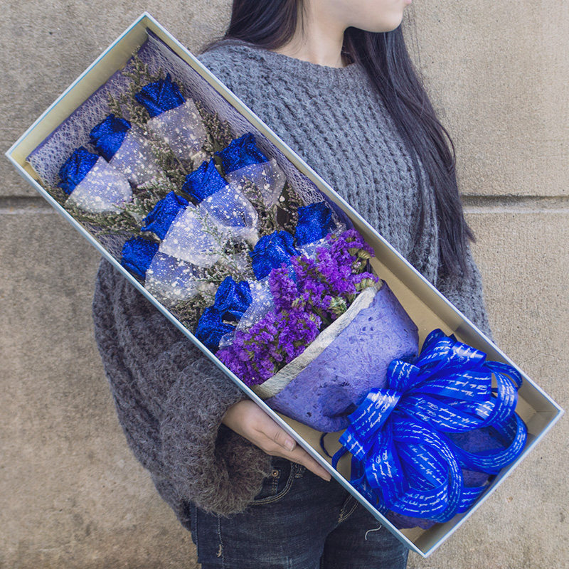 花 材:11朵精品蓝色妖姬(每朵用网纱单独包装),搭配情人草、勿忘我装饰。