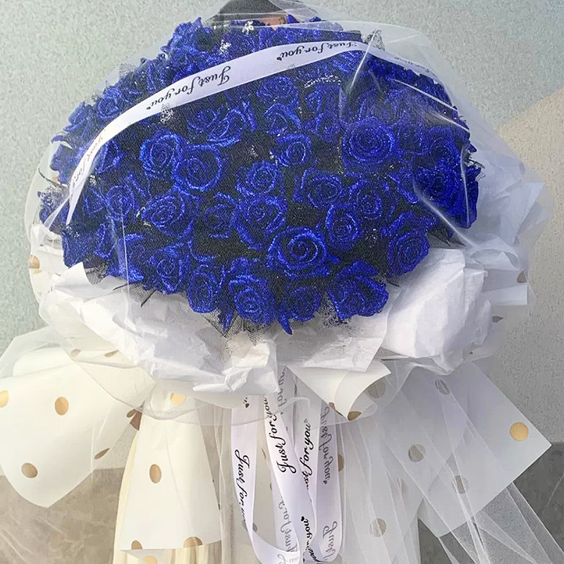 花 材:99朵精品蓝色妖姬,搭配白色英文缎带。