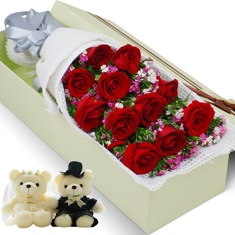 花 材:11朵红玫瑰,2只可爱小熊,搭配石竹梅装饰。