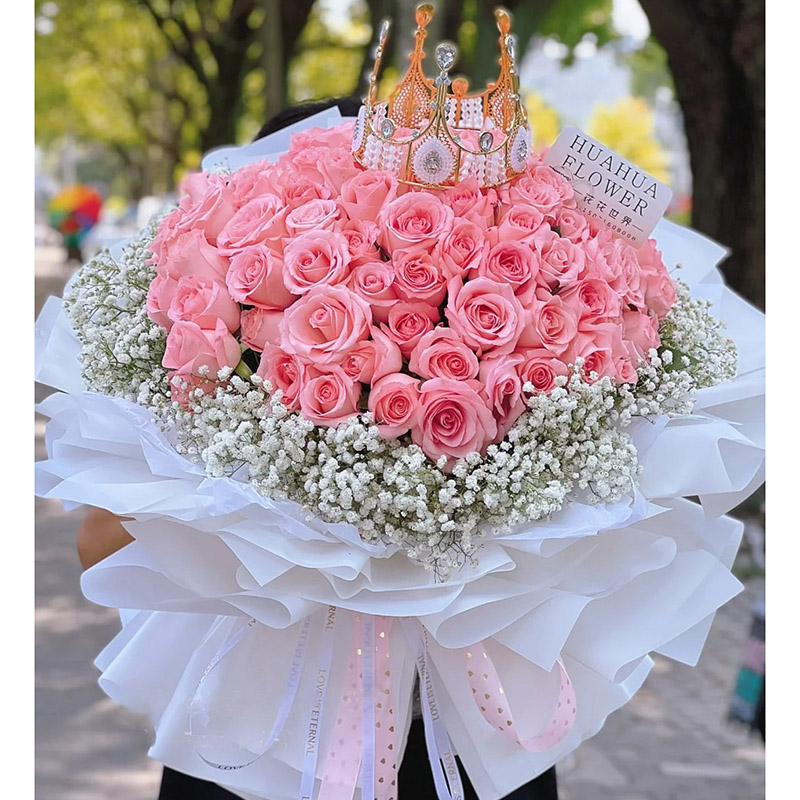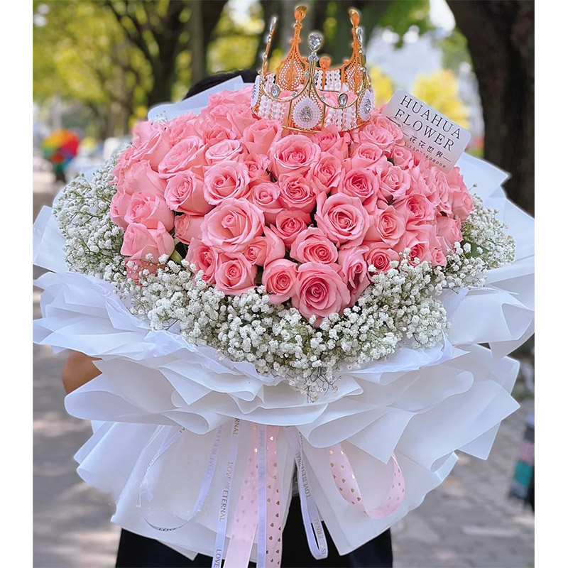 花 材:99朵粉玫瑰,1顶皇冠(款式随机)、搭配白色满天星环绕。