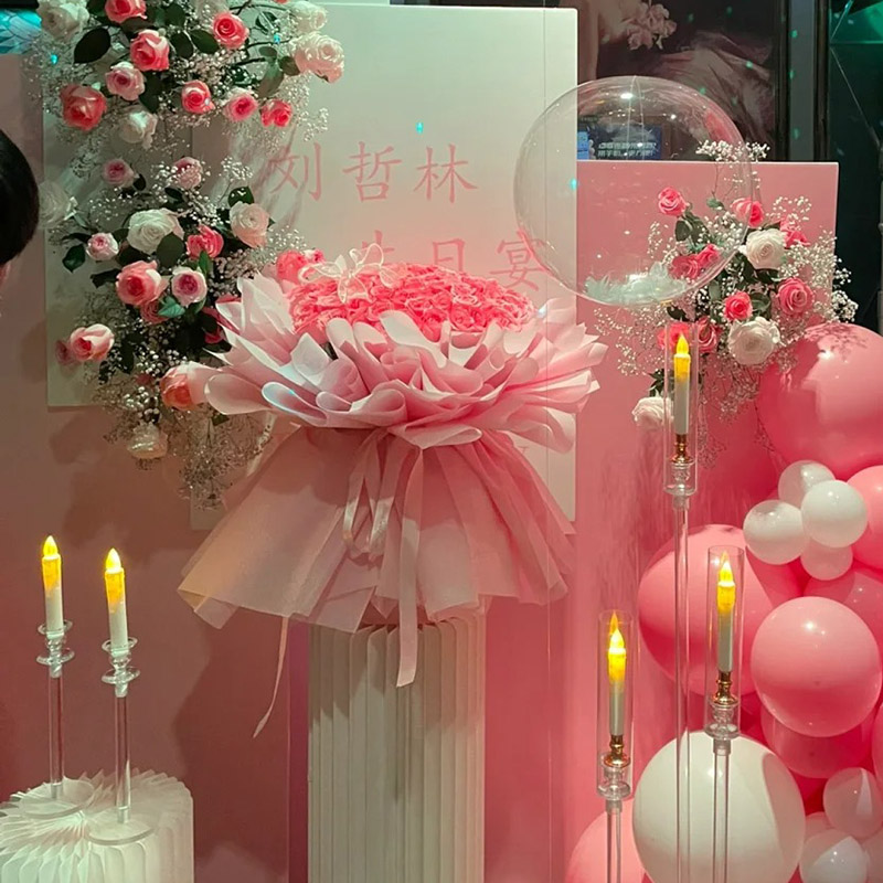 包 装:粉色雾面纸多层叠角包装,粉色花结。