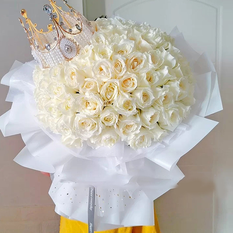 花材: 99朵精品白玫瑰,搭配皇冠装饰。