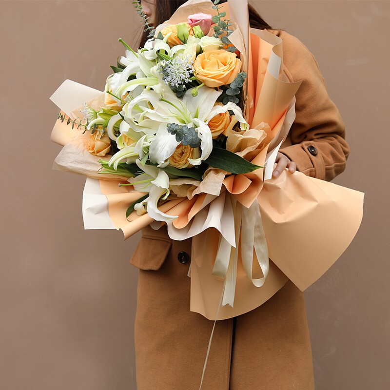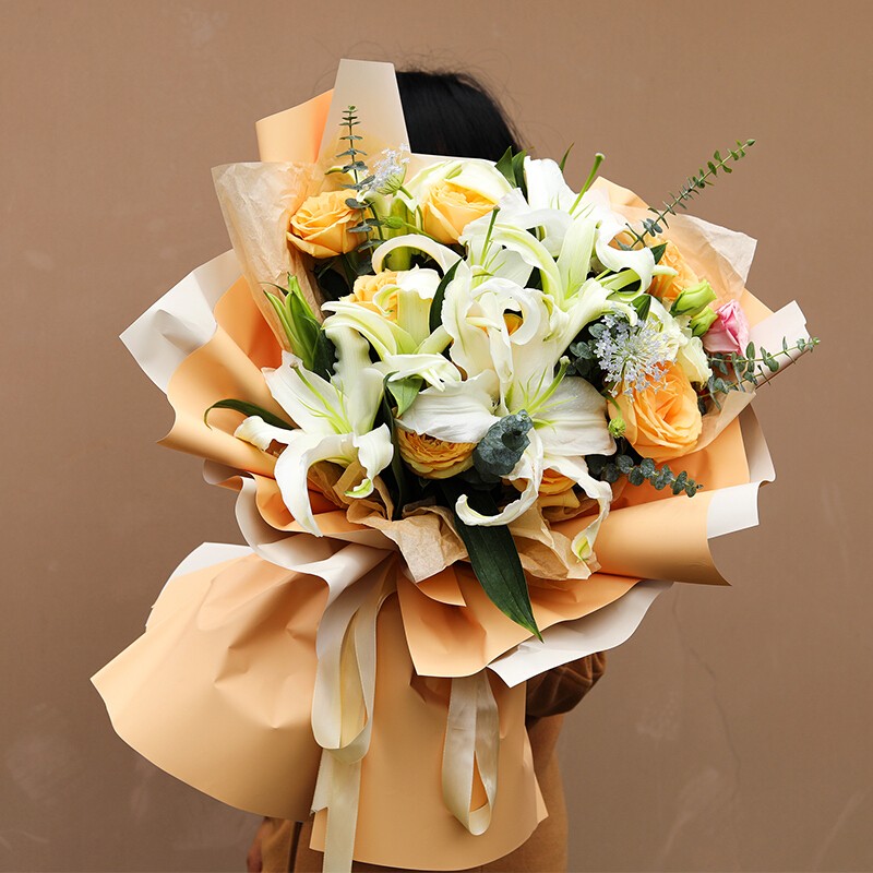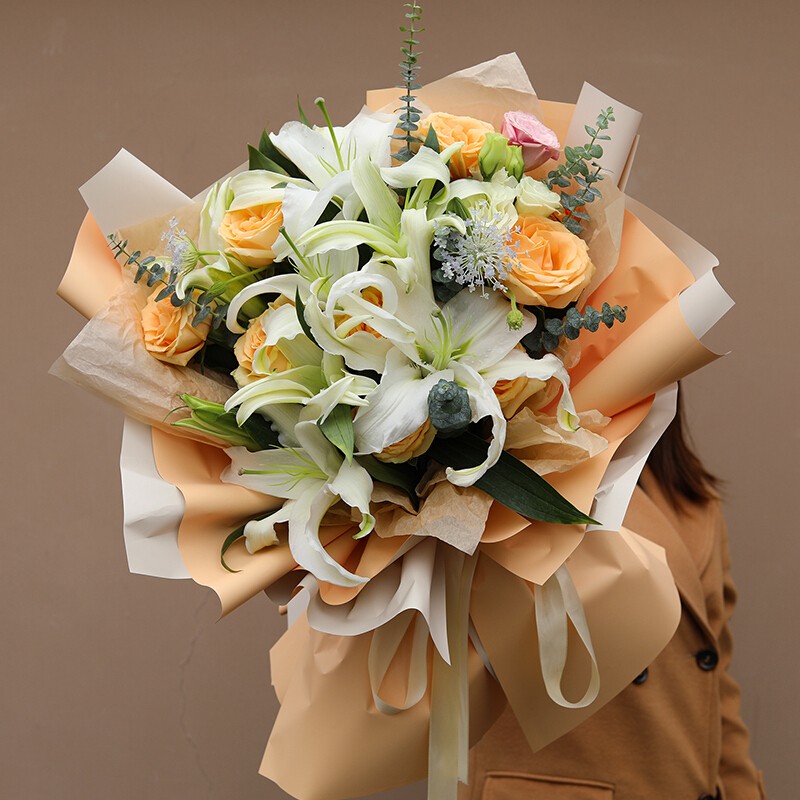 花材: 9朵香槟玫瑰,3支多头白百合,搭配桔梗、尤加利叶装饰。