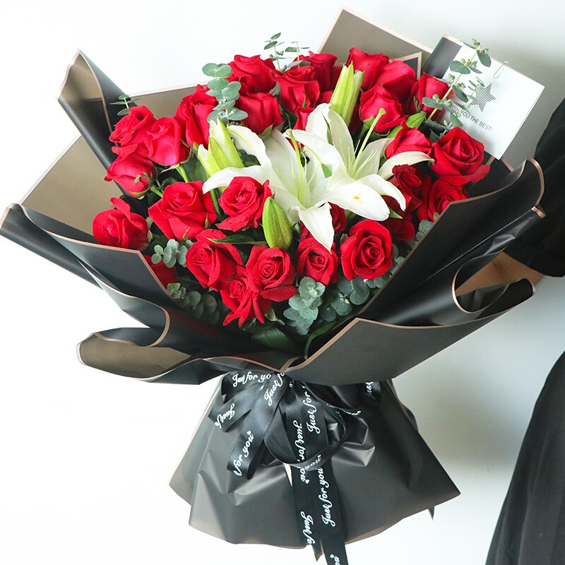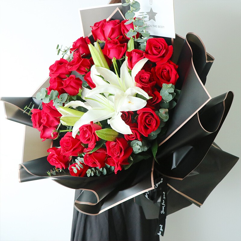 花材: 33朵红玫瑰,1支白色多头香水百合,搭配尤加利叶装饰。