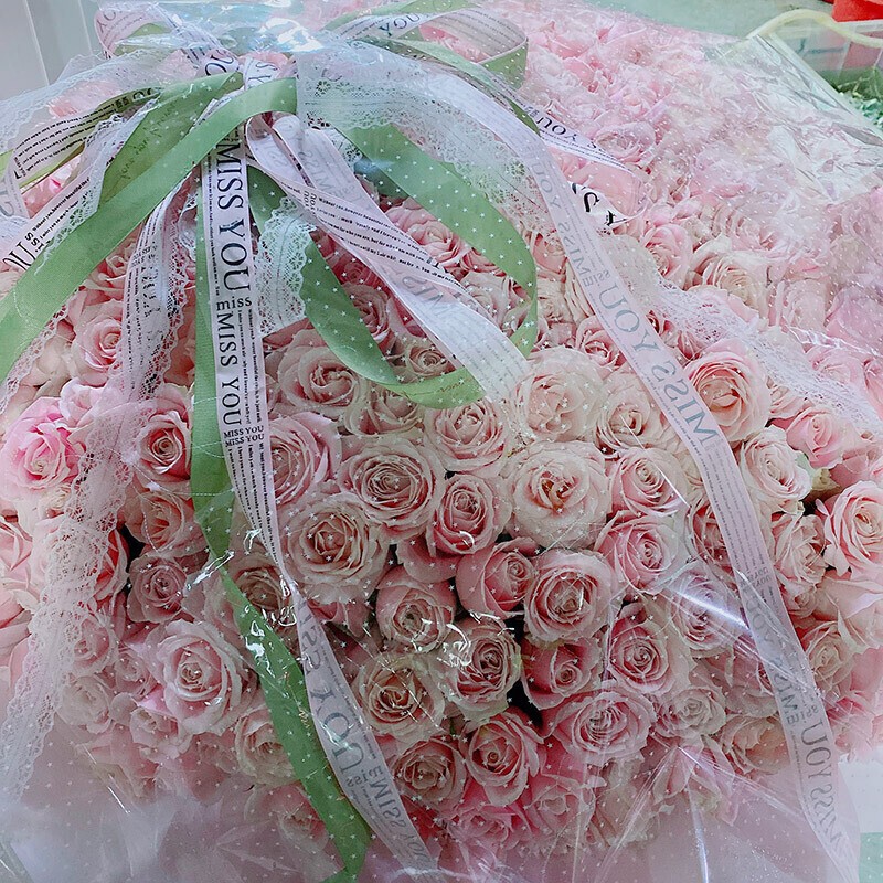 花 材:精选520朵优质粉玫瑰,花球造型,鲜花表面用绿色白色缎带花结装饰。
