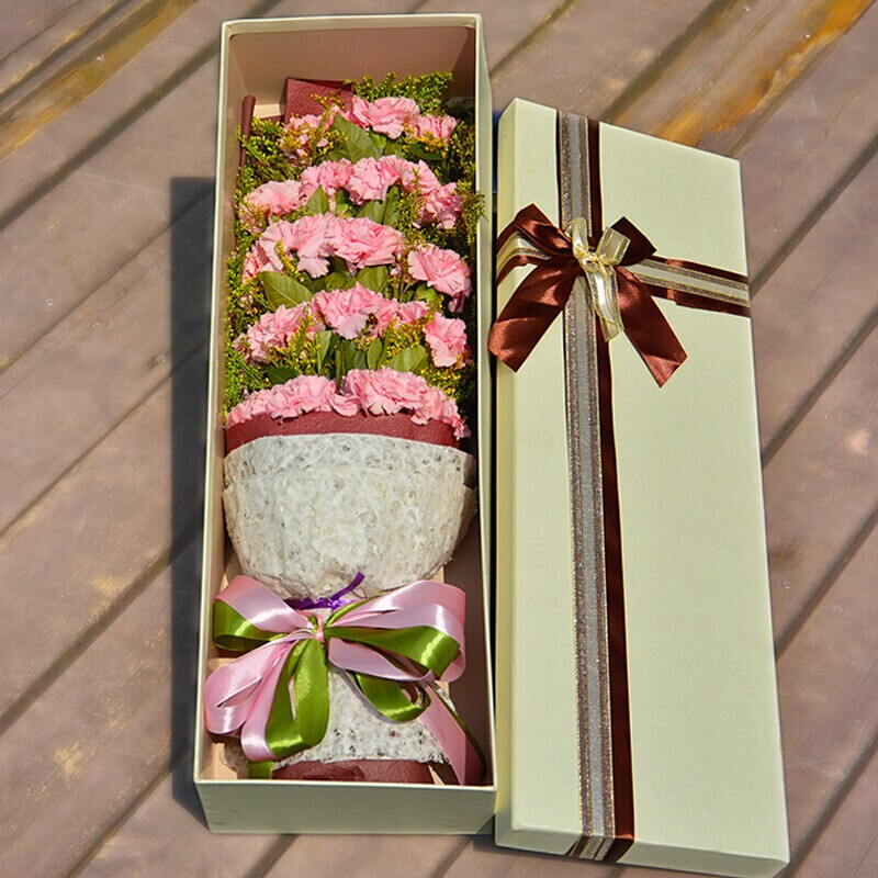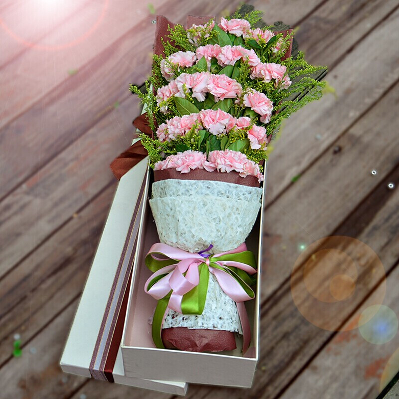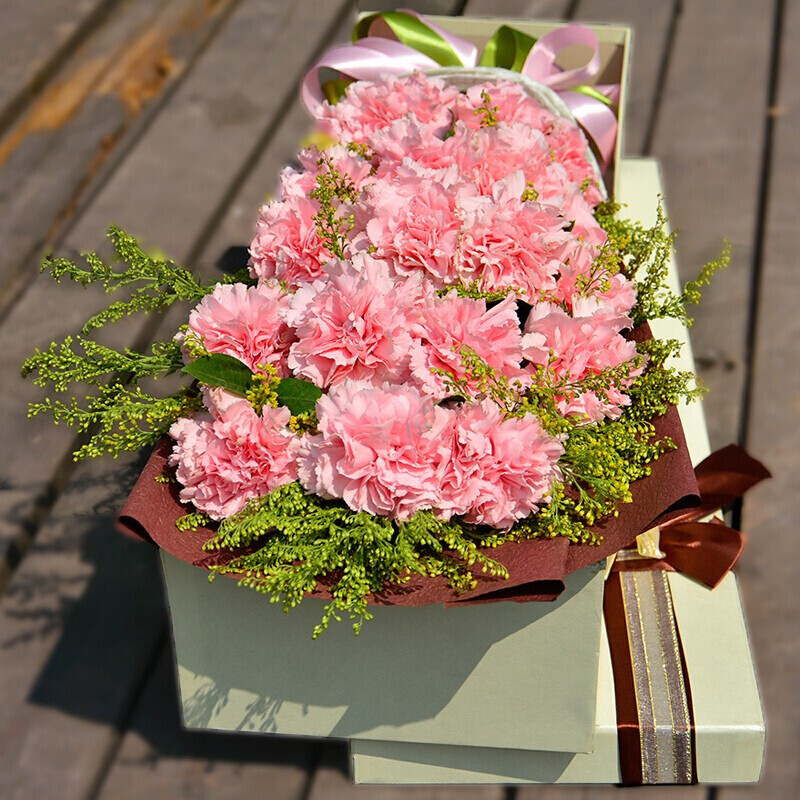 花材: 19朵精品粉色康乃馨,搭配黄莺草、栀子叶装饰。