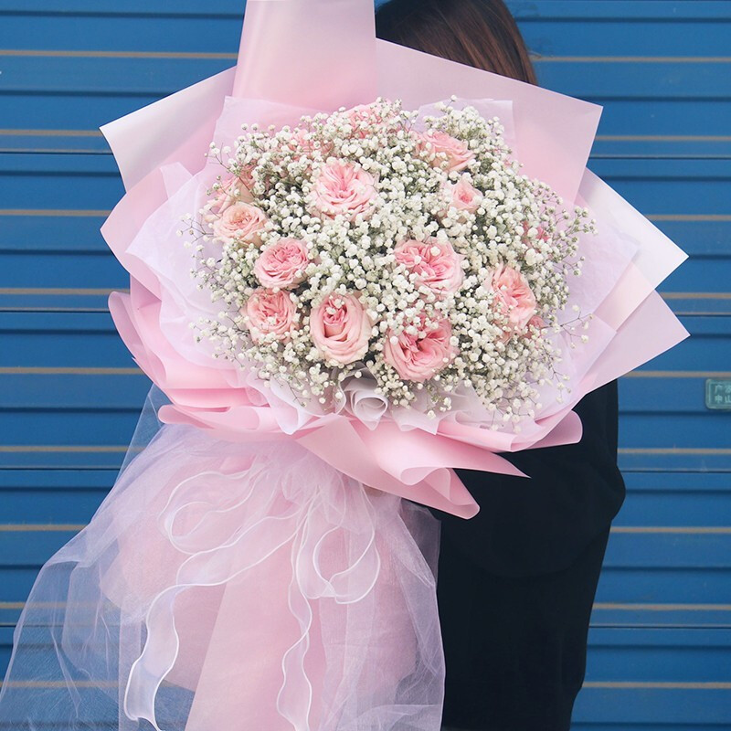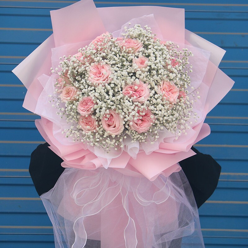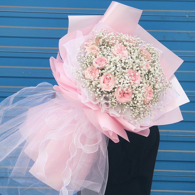 包 装:白色手揉纸内衬,粉色雾面纸扇形包装,外层白色韩式网纱装饰,白色丝带花结。