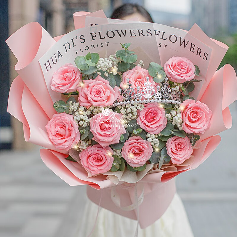 花材: 11朵粉玫瑰,1条灯带,1个皇冠(样式随机),搭配满天星尤加利叶装饰。
