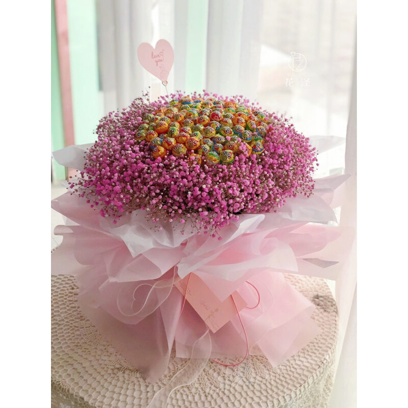 花材: 99颗棒棒糖,搭配粉色满天星外围环绕。