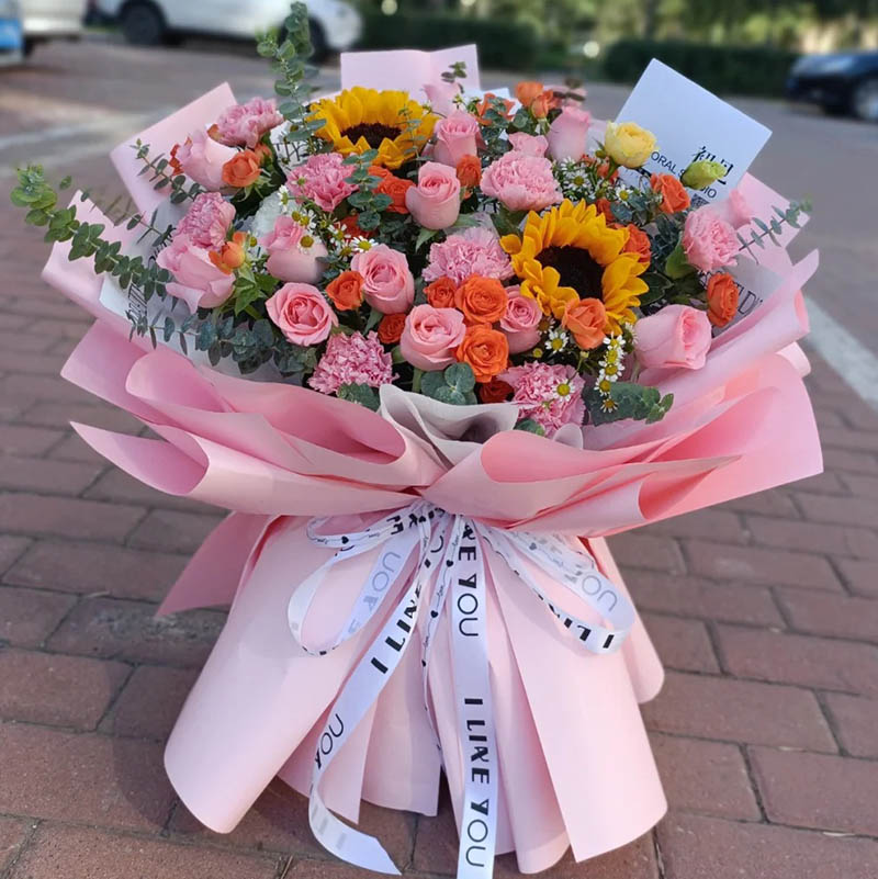 花 材:2朵向日葵,19朵粉玫瑰与粉色康乃馨混搭,9支多头橙色小玫瑰(断货则用同数量洋桔梗代替),尤加利叶、洋甘菊装饰。