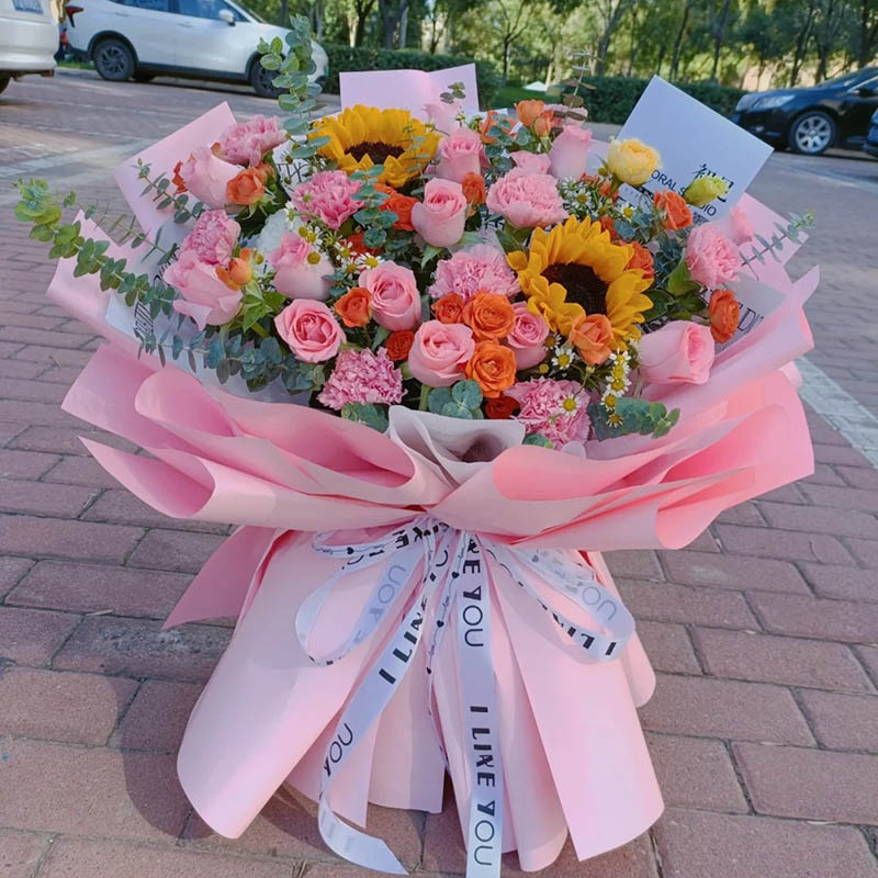 花材: 2朵向日葵,19朵粉玫瑰与粉色康乃馨混搭,9支多头橙色小玫瑰(断货则用同数量洋桔梗代替),尤加利叶、洋甘菊装饰。