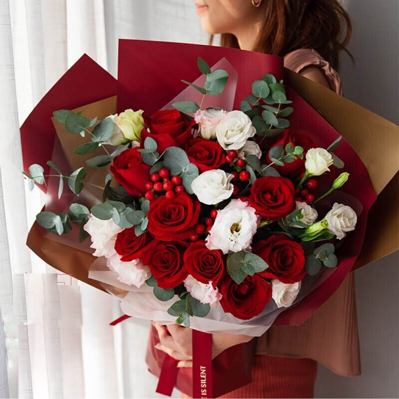 花 材:11朵精品红玫瑰,11支白色桔梗(若桔梗断货,则用相同数量白玫瑰代替),尤加利叶、红豆装饰。