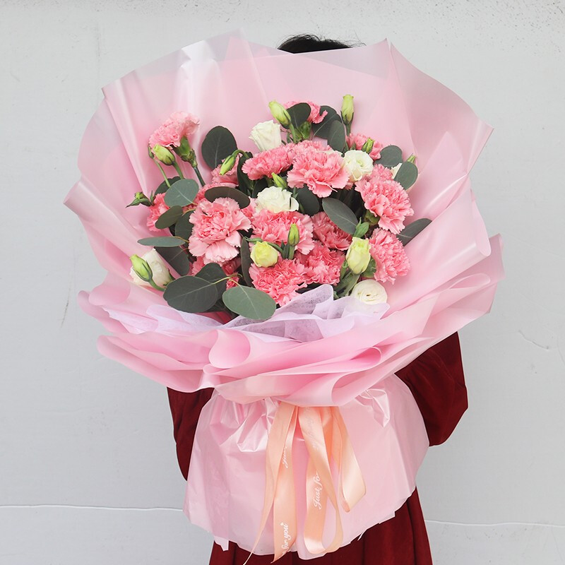 花材: 19朵粉色康乃馨,4支白色洋桔梗(可用白玫瑰替代),搭配尤加利叶等绿叶装饰。